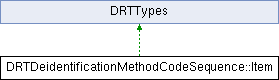 Inheritance diagram for DRTDeidentificationMethodCodeSequence::Item:Public Member Functions | |
