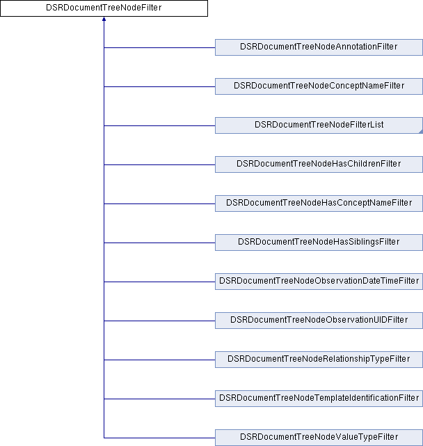 Implemented in DSRDocumentTreeNodeFilterList, DSRDocumentTreeNodeTemplateIdentificationFilter, DSRDocumentTreeNodeObservationUIDFilter, DSRDocumentTreeNodeObservationDateTimeFilter, DSRDocumentTreeNodeAnnotationFilter, DSRDocumentTreeNodeRelationshipTypeFilter, DSRDocumentTreeNodeValueTypeFilter, DSRDocumentTreeNodeConceptNameFilter, DSRDocumentTreeNodeHasConceptNameFilter, DSRDocumentTreeNodeHasSiblingsFilter, DSRDocumentTreeNodeHasChildrenFilter, DSRDocumentTreeNodeOrFilter, and DSRDocumentTreeNodeAndFilter.