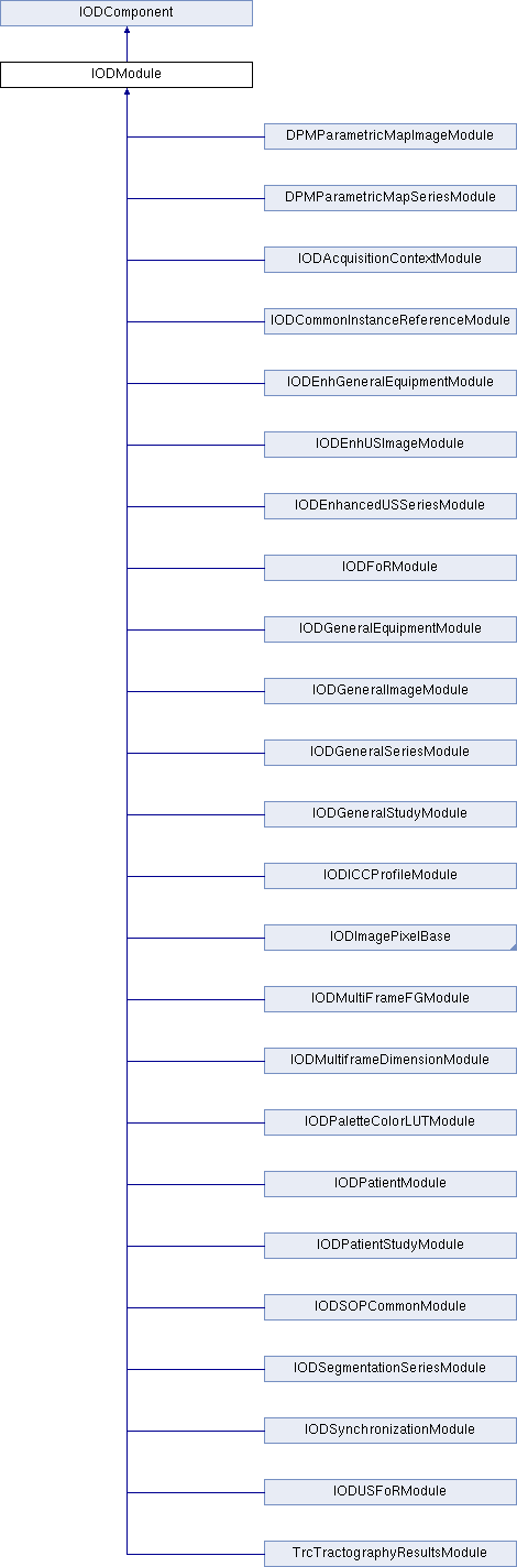 The class IODModule is an IODComponent without parent component since a module does always belong to the top level dataset. More...