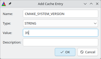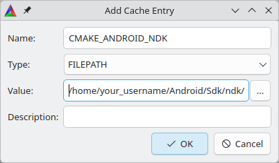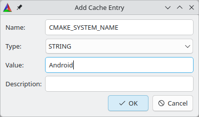 As a name, enter CMAKE_SYSTEM_NAME, Type is String and the value is Android. It should look like this: