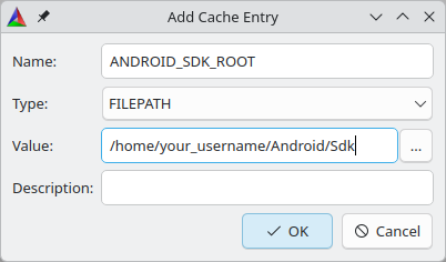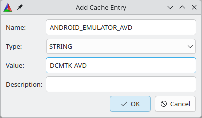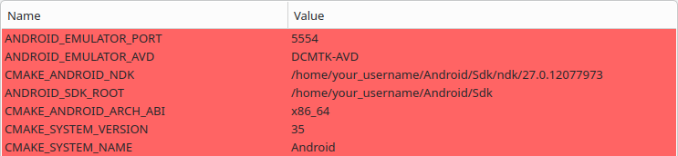 If you want to build the DCMTK without the CMake-GUI, you can use the command line interface of the operating system directly. For that to work, chage directory to where you want the binary files to be built. This would be the same directory as the CMake-GUI option Where to build the binaries: in the CMake-GUI. Then, enter the following command:cmake -G "Unix Makefiles" -DCMAKE_BUILD_TYPE:STRING=RELEASE -DCMAKE_SYSTEM_NAME:STRING=Android -DCMAKE_SYSTEM_VERSION:STRING=35 -DCMAKE_ANDROID_ARCH_ABI:STRING=x86_64 -DANDROID_SDK_ROOT:FILEPATH=/home/your_username/Android/Sdk -DCMAKE_ANDROID_NDK:FILEPATH=/home/your_username/Android/Sdk/ndk/27.0.12077973 -DANDROID_EMULATOR_AVD:STRING="DCMTK-AVD" -DANDROID_EMULATOR_PORT:STRING="5554" /path/to/dcmtk/source/directory